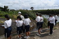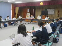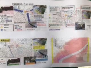 10月4日、生徒たちは、地区ごとに分かれ、各地区の方々から、これまでの水害の様子や危険な場所、防災についての備え等についてお話を聞いた後、実際に地区内を回って、危険箇所や災害時に役立つ場所などの確認をしました。それぞれの地区では、区長さんや地区の様子をよくご存じの方々が、資料を準備して丁寧な説明をしてくださり、その後のまち歩きでも一緒に歩いて案内をしてくださるなど、大変お世話になりました。地域の皆さんのおかげで、改めて自分たちの地区を知り、防災について考えることができました。ありがとうございました。