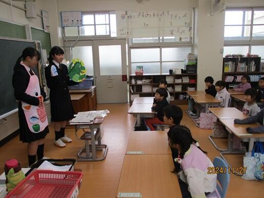 11月27日 高校生に和食について教わりました 投稿日時 : 2024/11/29 滝野東小学校管理者 カテゴリ: 社高校生活科学科の生徒が、和食について1年生に教えにきてくれました。 お箸でしてはけないことやお箸の上手な使い方を教えてもらいました。 大豆や小豆や黒豆を器から隣の器に箸で移す練習もしました。 また、豆についてもいろいろと教えてもらいました。 12月11日の給食は、社高校生活科学科の生徒が考えた和食メニューが出ます。 0 {{options.likeCount}} {{options.likeCount}} {{options.unlikeCount}} {{options.unlikeCount}}