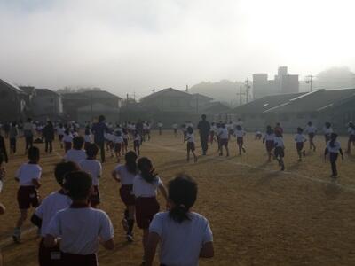 始まる時刻が決まっているのですが、多くの子どもたちがその時刻よりも早く運動場に出て走っています。