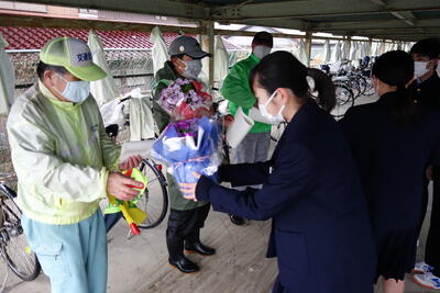 3月18日(金)、新生徒会中央委員が見守り隊の方々に感謝状と花を贈呈し、感謝の気持ちを伝えました。