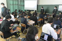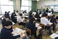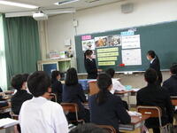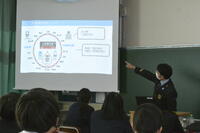 11月24日の「和食の日」に合わせて、11月22日(火)に、社高校生を講師に迎え、2年生が食育の学習に取り組みました。2年生3クラスを社高校生活科学科の高校生2人ずつで担当し、和食について授業をしてもらいました。多様で新鮮な食材の持ち味を生かし、栄養バランスに優れた健康的な食生活ができる「和食のよさ」、心臓や脳、生活習慣病の予防に役立つ「魚のよさ」、米の消費量が減ってきていることなど、和食についての説明を聞きました。