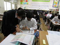 その後、ワークシートを活用しながら、和食の献立づくりをしました。1日に必要な栄養価を考えながら、バランスのよい献立を考えます。高校生のお姉さんにアドバイスをもらいながら、真剣に、楽しく取り組んでいました。