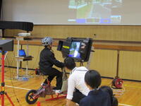 加東警察署の方から交通ルールについて学んだ後、代表者が自転車シュミレーターにチャレンジしました。