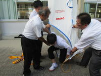 今年度は、逃げ遅れた生徒たちが、3階から新しくなった避難袋で脱出する訓練も行いました。