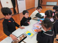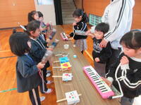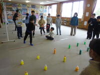 12月4日(木)、1年生が河高こども園、高岡育児園の年長組、本校に入学予定の他園の年長組を迎え、「なかよしランド」を開催しました。1年生は、この日を迎えるまでに6つのお店を開店させるべく準備を進めてきました。パズル遊び、どんぐりごま遊び、つり遊び、合奏にあわせたリズム遊び、ビュンビュンごま遊び、どんぐりはじき遊びなど、年長組さんに楽しんでもらえる遊びを1年生の子どもたちが考えました。お金のかわりにどんぐりを使い、1どんぐりで1ゲームができるルールで、年長組さんに6つのお店を順番に回ってもらいました。どの園児も1年生も笑顔にあふれ、楽しい交流となりました。