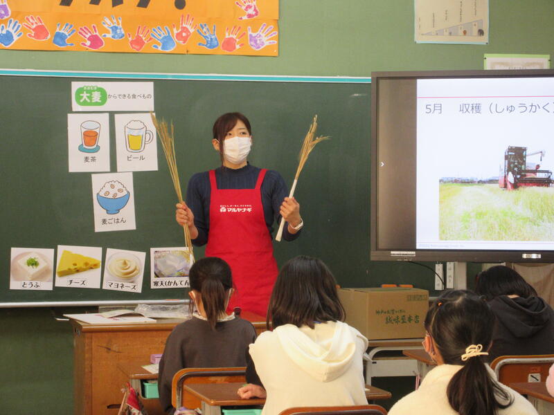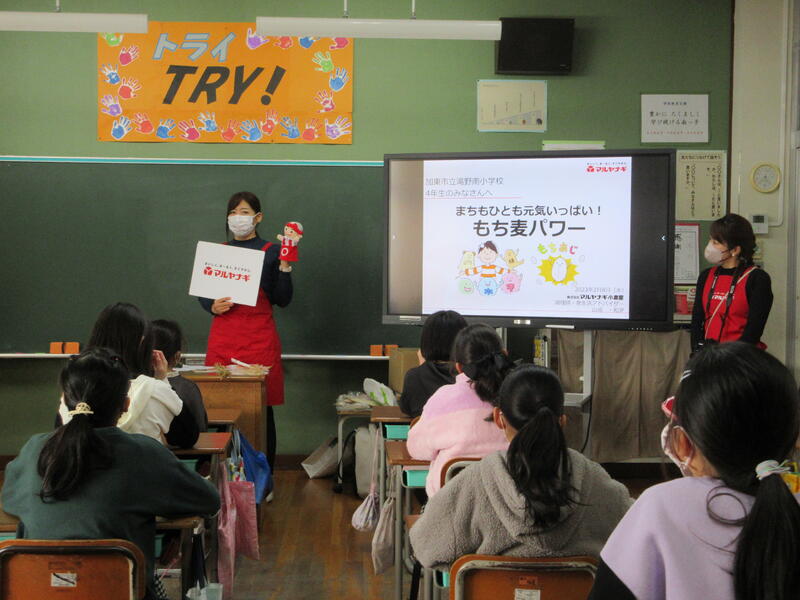 2月8日(水)、マルヤナギの方に来ていただき、4年生がもち麦の学習をしました。加東市ではマルヤナギとJA、農家の方が協力し、もち麦を栽培していること、もち麦の特徴、栄養、食べ方などを教えていただき、子どもたちは興味津々で聞いていました。給食にも月に2回程度出てくるもち麦を通して、子どもたちが食について関心をもつと共に、加東市の特産物について興味をもってくれればいいなと思います。子どもたちには「もち麦の歌」が楽しかったようです。