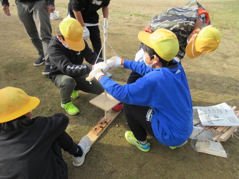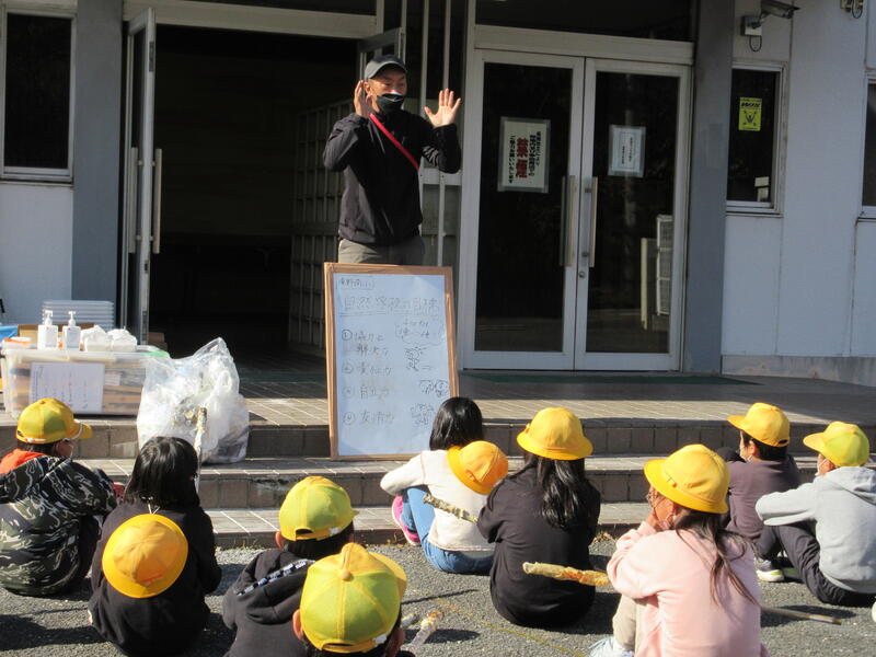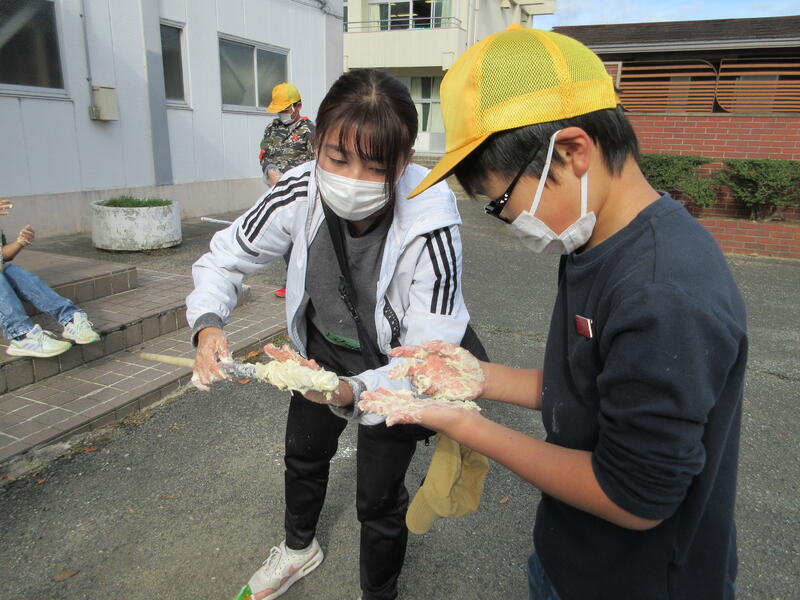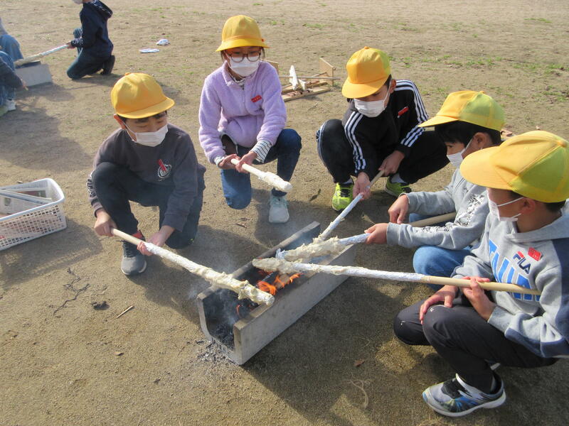 12月2日(金)、5年生が自然学校パート2を行いました。7月の自然学校でお世話になったリーダーさんたちに学校に来ていただき、火起こし体験をして、棒焼きパンを作りました。初めにパンの生地作りをしました。ビニール袋の中でパン生地をこね、暖かい場所で発酵させている間に火起こしをしました。班のみんなで力を合わせ火種を作りますが、これがなかなか根気のいる作業で「いち、に、いち、に。」と声をかける人、木を上下に動かす人、摩擦させる下の木が動かないように体重をかけて重しをする人などに分かれて、火を起こしました。共同作業が成功してうまく火種ができたら、それを大切に麻紐をほぐした物に移し、息を吹きかけながら火を大きくしました。時間の許す限り頑張ったけどうまくいかなかった班は、メタルマッチを使って火を起こしました。アルミホイルを巻いた棒にパン生地を巻き付け、焼いていただきました。焼きたてのパンを頬張った子どもたちは、「おいしい!」と大喜びでした。火を利用することを思いついた大昔の人に驚くと共に、時間をかけて作った火種を大切にして、生活に利用してきた人間の智恵と工夫を知ることができ、貴重な時間となりました。
