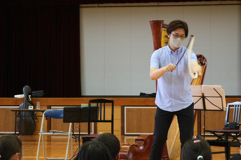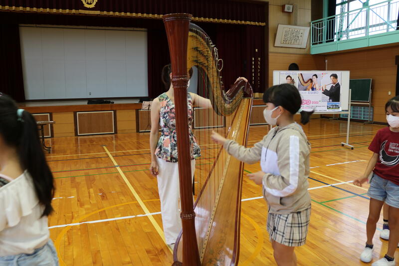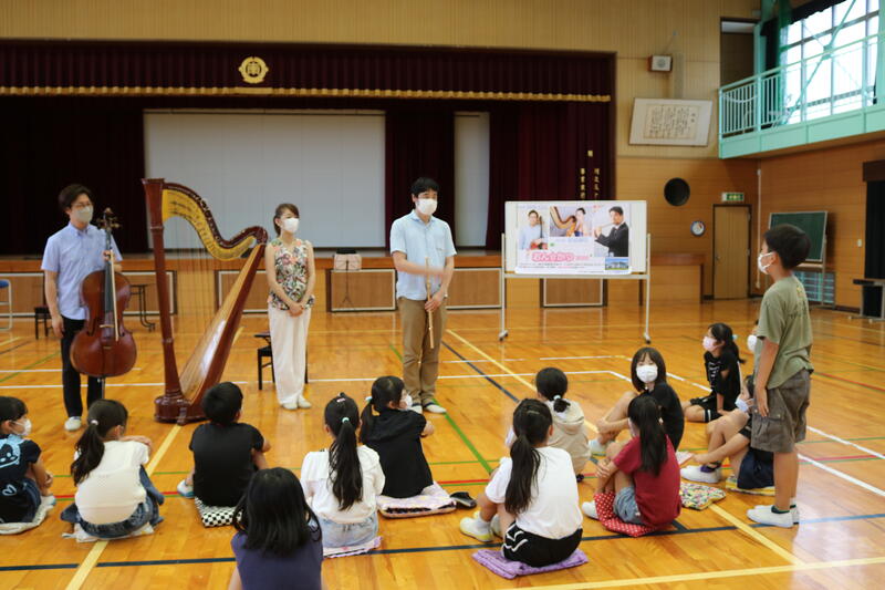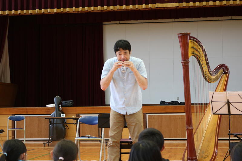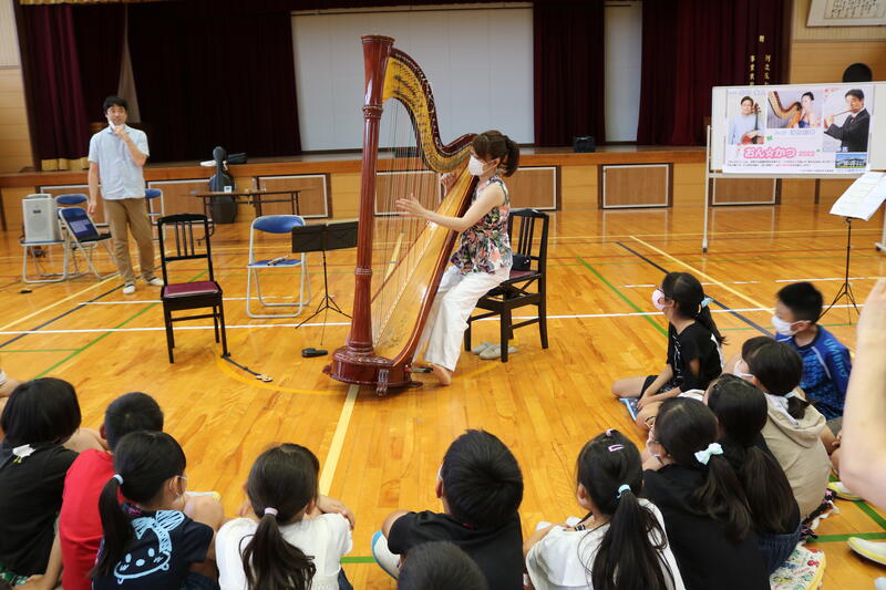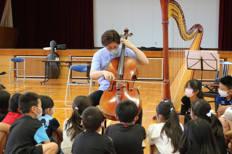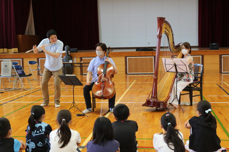 6月15日(水)、今年度も「おんかつ」で音楽家の方に学校にきていただき、4年生を対象に演奏を聴かせていただいたり、楽器の説明をしていただいたりしました。今年度は、フルートとチェロ、ハープの演奏家の方が来てくださり、全校生にミニコンサートもしていただきました。美しい音色と馴染みのある曲に子どもたちは大喜びで、聴き入っていました。4年生の子どもたちは、最後にハープの弦に触らせてもらい、大満足でした。素敵な演奏を、有難うございました。