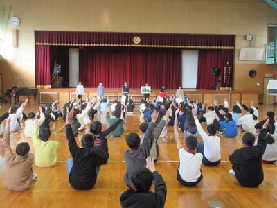 2月18日(火)の集会は、健康委員会による「旬の食べ物」の紹介でした。旬の食べ物は、味がおいしいだけでなく栄養価にも優れていると言われています。健康委員会の子どもたちが紹介した食べ物は、白菜、大根、りんご、ブロッコリー、カキ、エビです。白菜は中国が原産地であること、大根は先の方が辛いこと、りんごはじゃがいもの芽を出にくくする働きがあることなど食べ物に関係するエピソードを紹介してくれました。