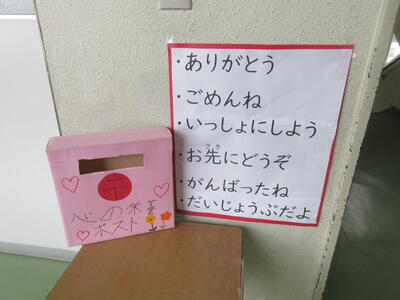 今月、情報委員会が廊下に「心の栄養ポスト」を設置し、手紙で感謝の気持ちを伝え合う場を設けてくれています。「ありがとう」「ごめんね」「いっしょにしよう」「お先にどうぞ」「がんばったね」「だいじょうぶだよ」といった言葉には、人の心を優しく元気にする力があります。もちろんこのような言葉は直接伝えることが大切ですが、改めて手紙に書くことで友達の良い面を見る力が育ちます。ポストに入れられた手紙は、情報委員会がお昼の放送で紹介しています。放送の時間は温かい言葉で校内が包まれたように感じます。このように、委員会活動は児童の生活をより豊かなものにしてくれています。