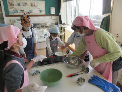 2月14日(金)、3年生が、国語科「すがたを変える大豆」の学習や総合的な学習の一環として豆腐を作りました。「加東市いずみ会」の皆様に豆腐のつくり方を教えていただきました。まずは、大豆をミキサーにかけて、細かくクリーム状にした「生呉」をつくりました。それを中火で煮立てて呉汁をつくり、その後、木綿の袋に入れてしぼり、豆乳とおからに分けました。豆乳が豆腐のもとになるわけですが、おからも味をつけて煮たり、ドーナツやクッキーなどのおやつにしたりして食べることができると教えていただきました。子どもたちは、食材を無駄にしない昔の人の知恵に感心しました。完成した豆腐は、醤油をつけていただきました。子どもたちの「おいしい!」の声が響きました。