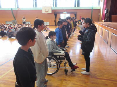 次に、児童会役員選挙の結果発表があり、新たに新6年生から2人、新5年生から2人が選ばれました。その後、今年度の児童会役員から選挙に立候補した22名の子どもたち一人一人に「賞」が贈られました。立候補した子どもたちの表情はやりきった達成感で満ち溢れていました。きっとこれからも何をするにも自分事としてとらえ、全力を発揮してくれることでしょう。最後に全校生から22名の立候補者に大きな拍手が送られました。