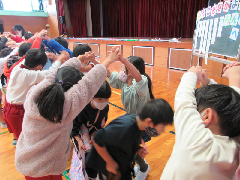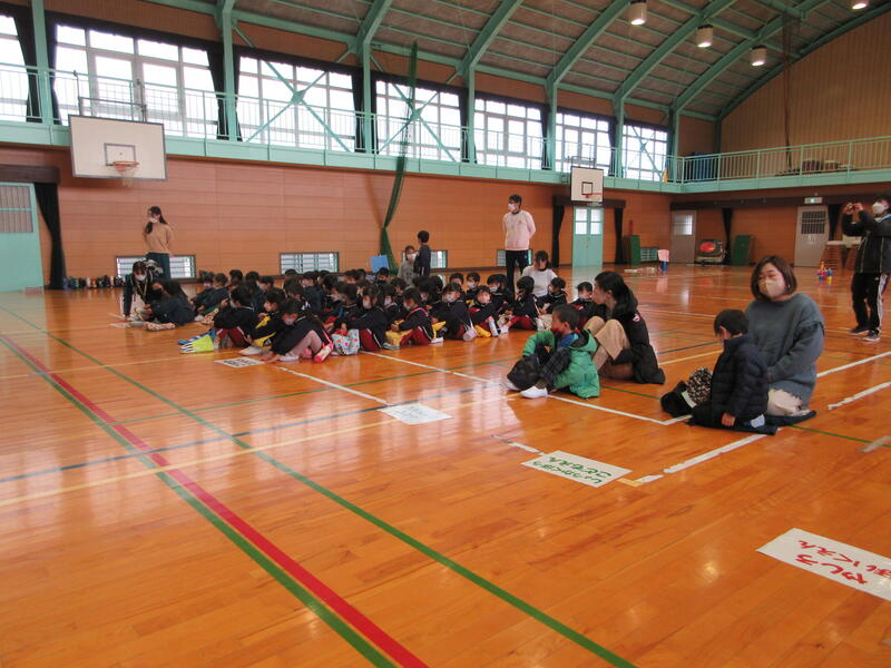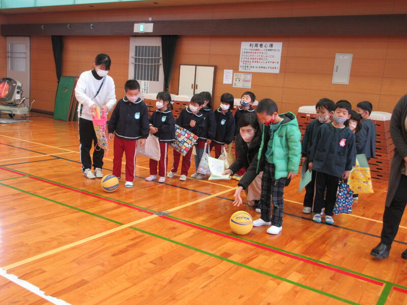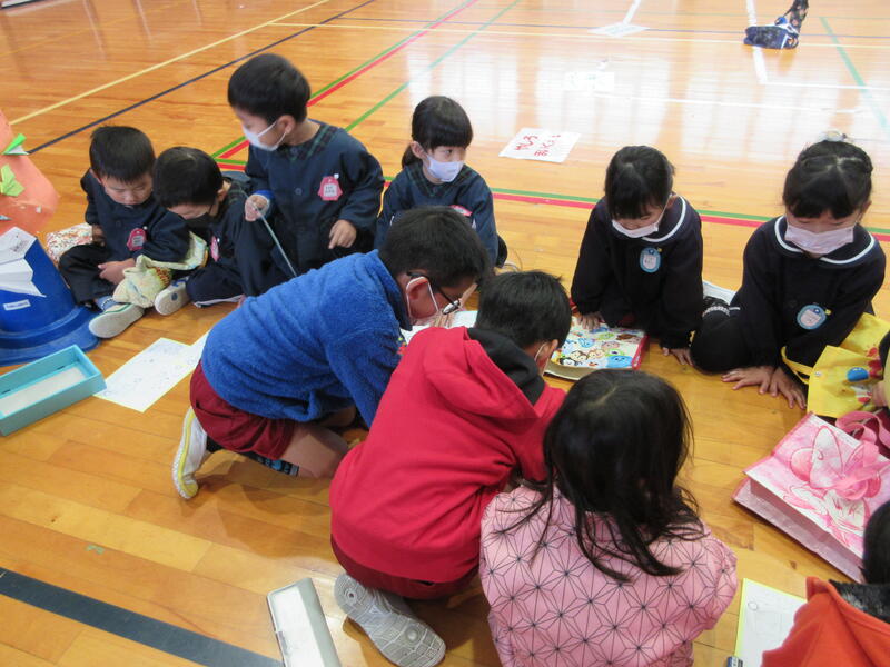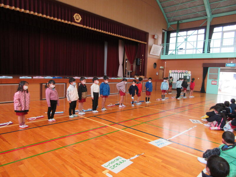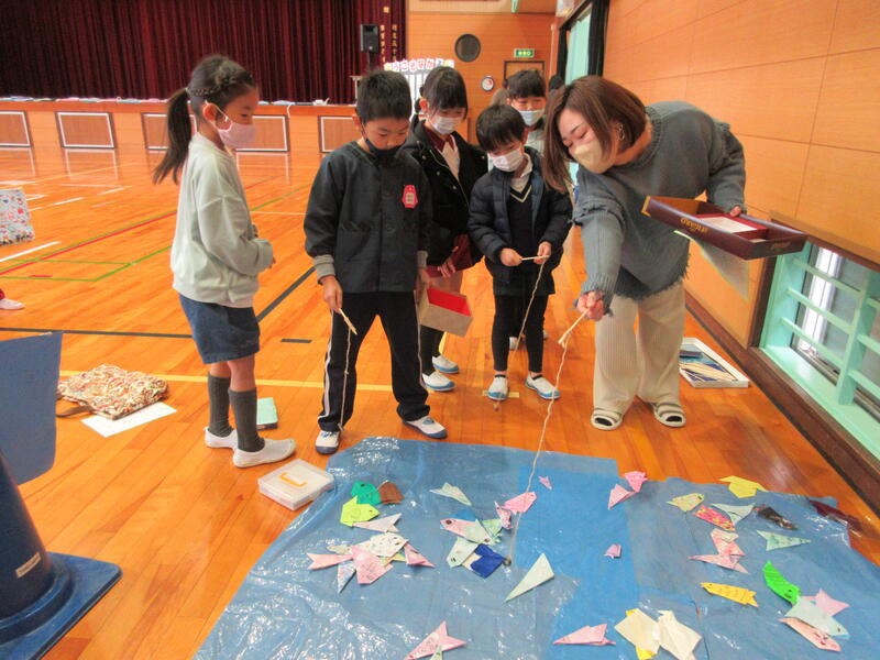 12月5日(月)、地域のこども園の年長さんを招いて、1年生の子どもたちが学習の様子を見せたり、一緒に遊んだりしました。学習は、音読や算数の計算、外国語の学習の様子を紹介しました。音楽会で歌った歌や鍵盤ハーモニカの演奏も披露しました。遊びでは、紙飛行機、ボーリング、シュリケン、どんぐり迷路、魚釣りなど5つのコーナーに分かれて、1年生が遊び方を教えました。60人近い年長さんを楽しませるために、18人の1年生が一生懸命活動しました。「早く小学校に行きたいな。」と思ってもらえたら嬉しいです。