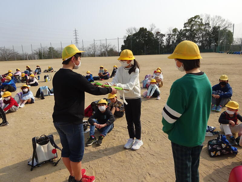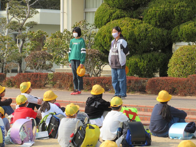 3月8日(水)、一斉下校前に、通学班長・副班長の引き継ぎ式が行われました。5年生の代表児童が、お世話になった6年生の班長、副班長にお礼と決意を伝えました。また、6年生の代表からは、新班長、副班長、班員へメッセージが伝えられました。通学旗の受け渡しが行われ、この日から、新体制で下校しました。6年生のみなさん、1年間有難うございました。みなさんのおかげで、安全に登下校することができました。新体制での登下校が始まりましたが、5年生を中心に、子どもたちは張り切って、元気に登下校しています。あいさつも元気です。