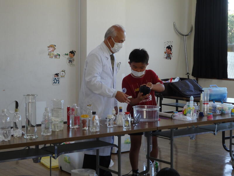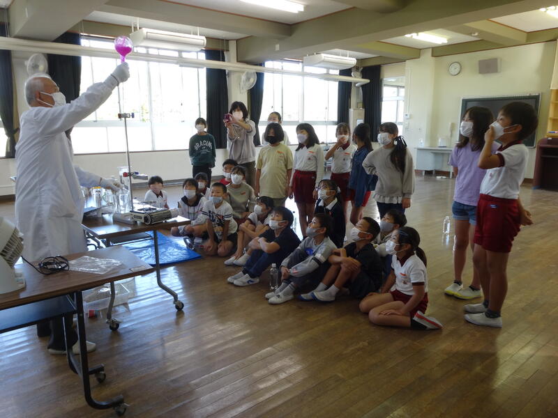 10月13日(木)、「サイエンス・トライやる」事業で、齋藤賢之輔先生にお越しいただきました。4年生の子どもたちは、水や空気を使ったさまざまな実験を見せていただき、「えっ1!」「どうして、そうなるの?」「うわあ!すごい!!」「ふしぎやなあ」と素直な声をあげました。ペットボトルの中でできる竜巻、穴が空いているのにこぼれないペットボトルの水、逆さまにしてもこぼれない水、茶色の水が透明に変身する実験、空気の流れがわかる紙風船とドライヤーを使った実験など、あっと驚くような実験の数々に、子どもたちは夢中になり見入っていました。「どうして?」「ふしぎだな」と感じる経験が科学への興味につながるのですね。齋藤先生、楽しい時間を有難うございました。